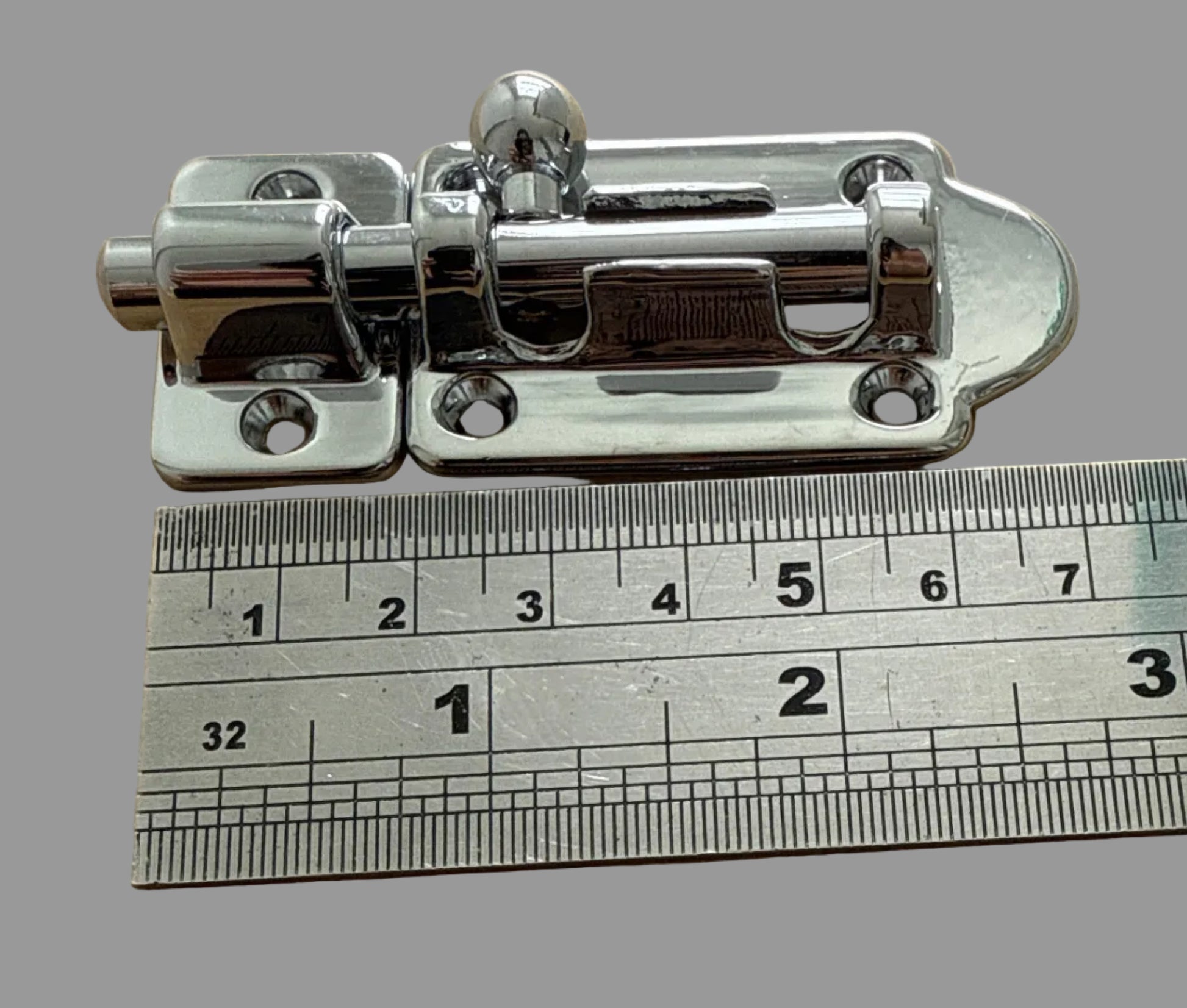 Beautifully made highly polished chrome on brass compact barrel bolt in a marine quality finish. Used to retain boat companion way doors and as a privacy bolt on toilets and bathrooms.