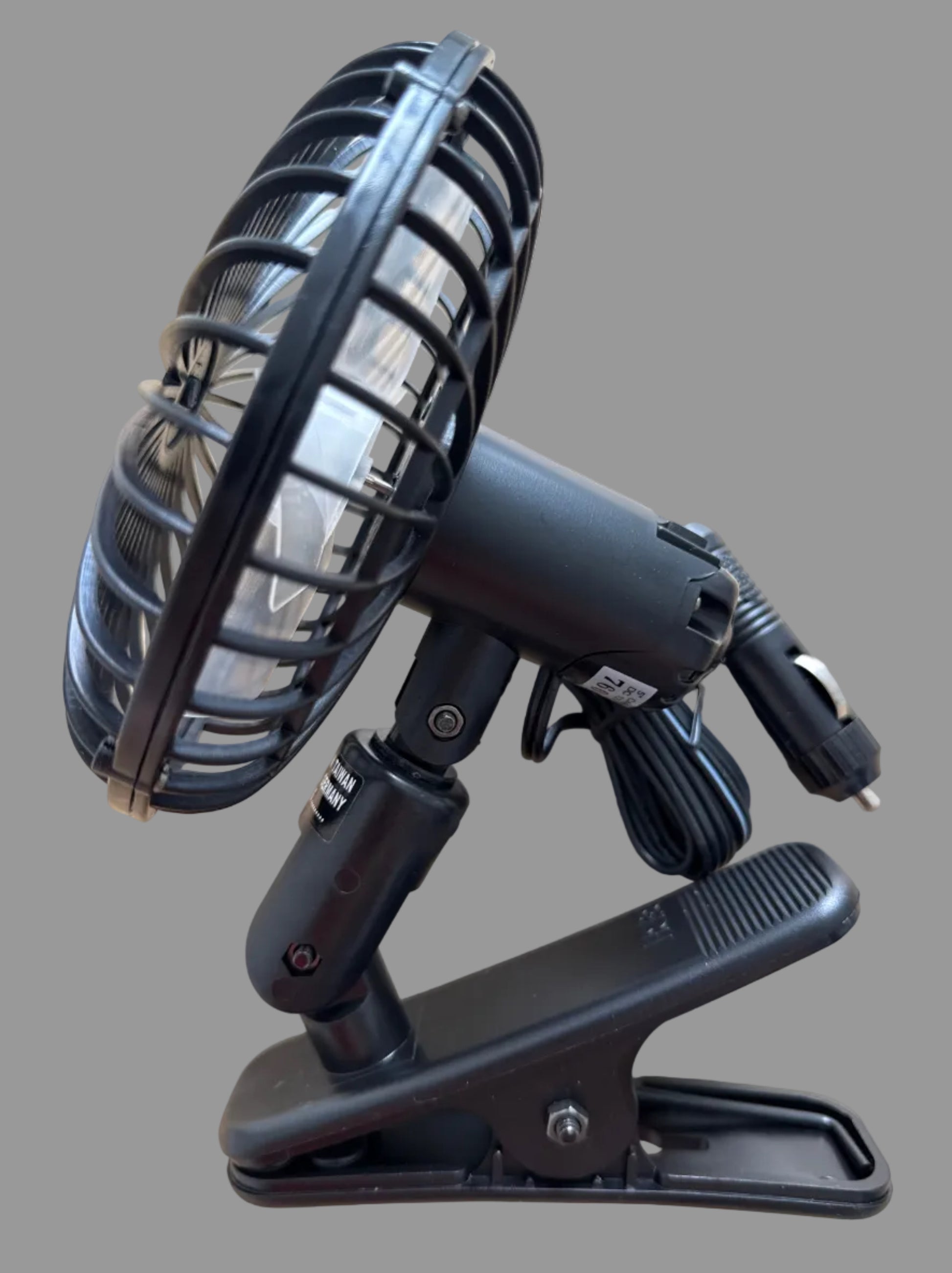 Cooling fan 12 volt 2 speed settings. No installation needed, simply clip on whenever it’s required and plug into your dashboard socket. Big rubber coated clamp, will clamp onto up to 40mm surface.