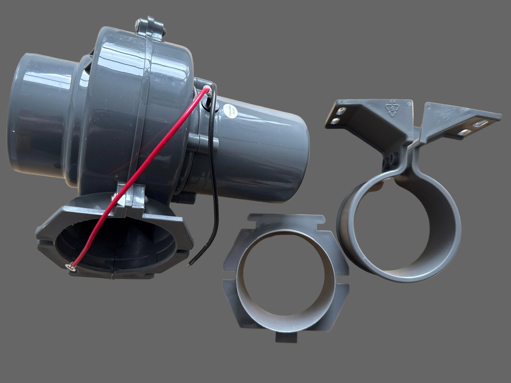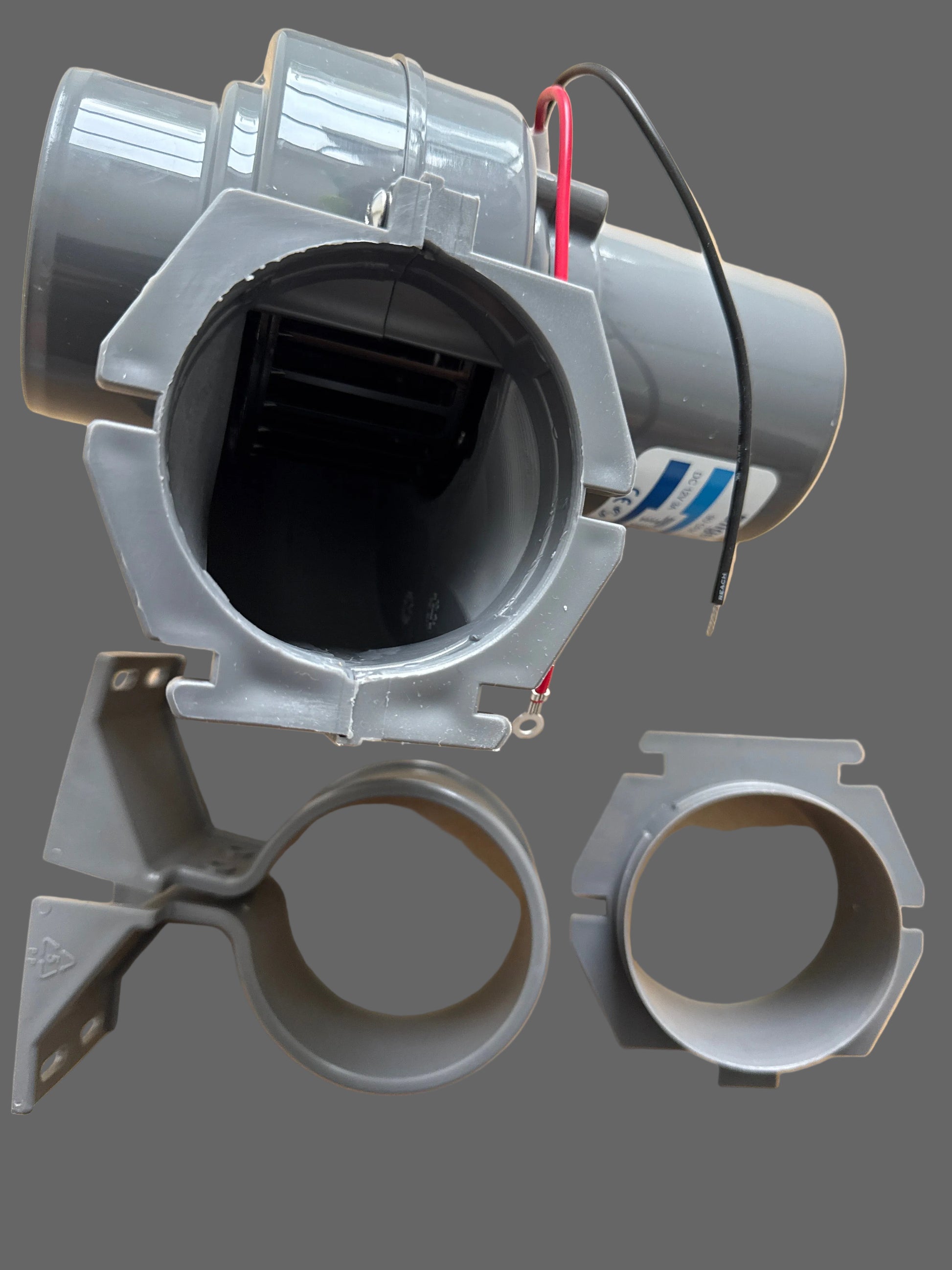 Spark proof, lightweight plastic housing with 4 fixing points on outlet flange to cover a 75mm hole. Inlet to take 75mm duct / hose.