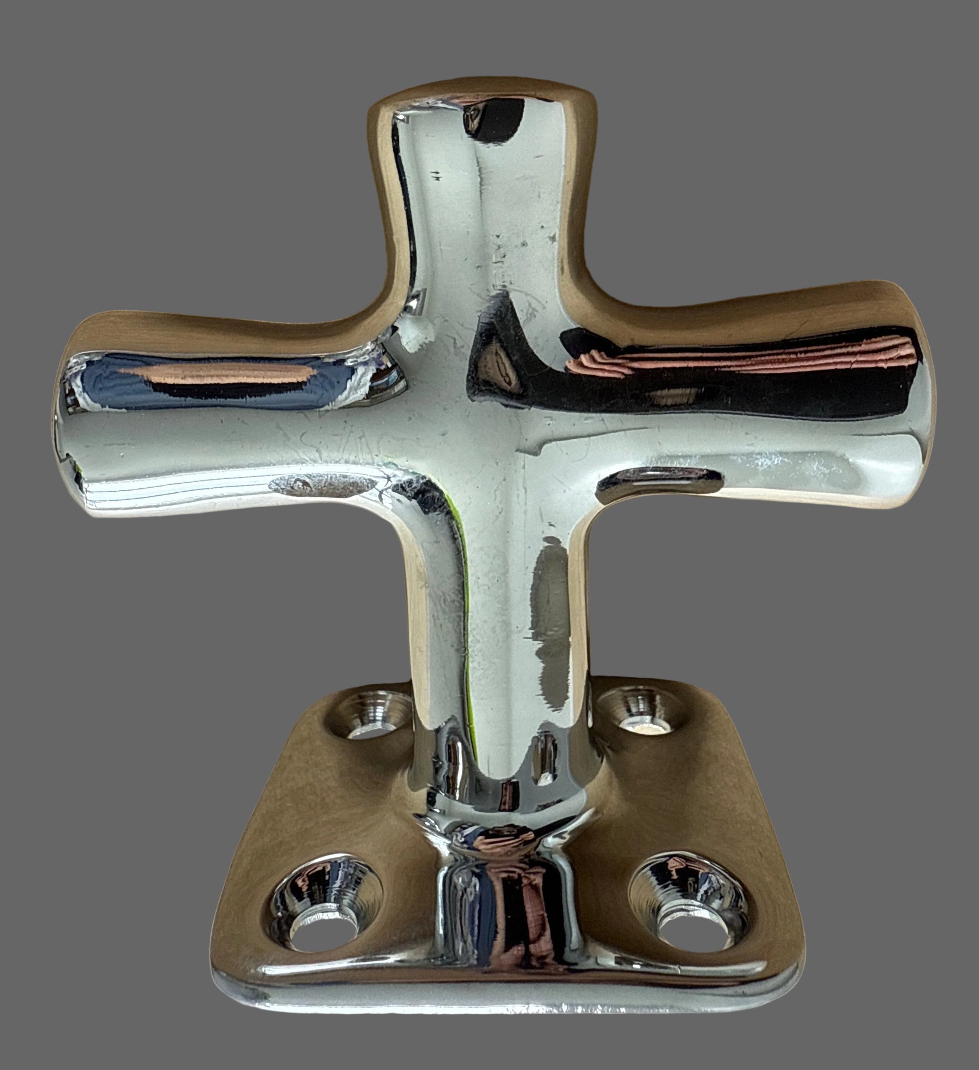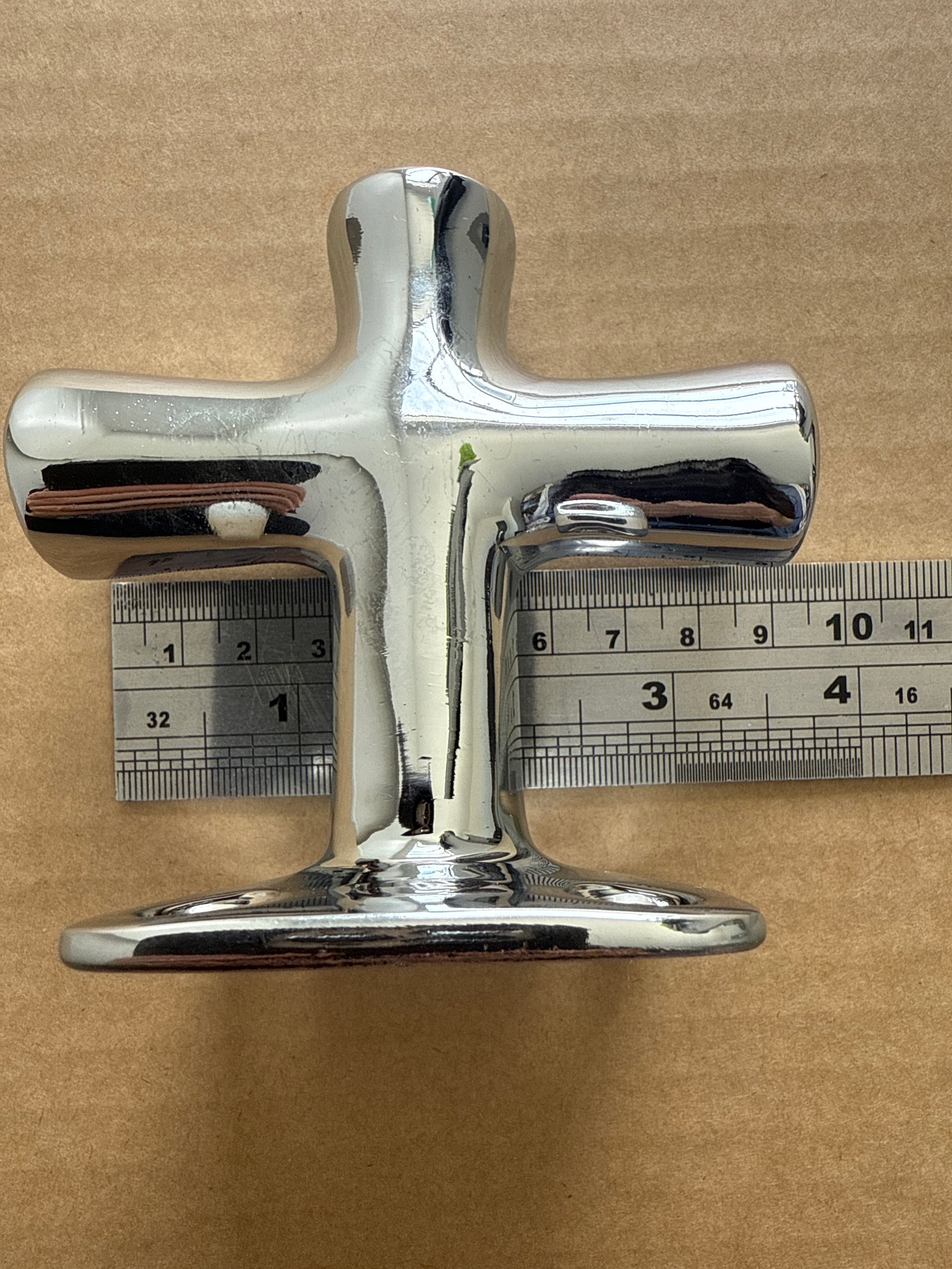 Streamlined highly polished traditional chrome on brass mooring bollard. Low profile three hole fixing.