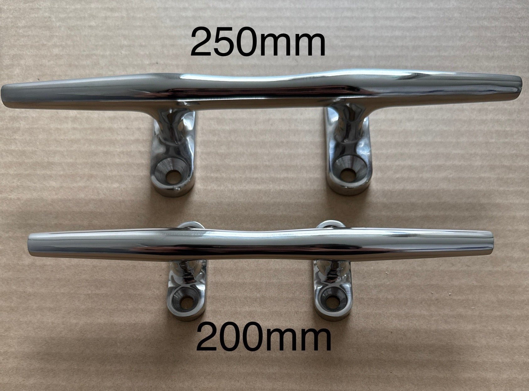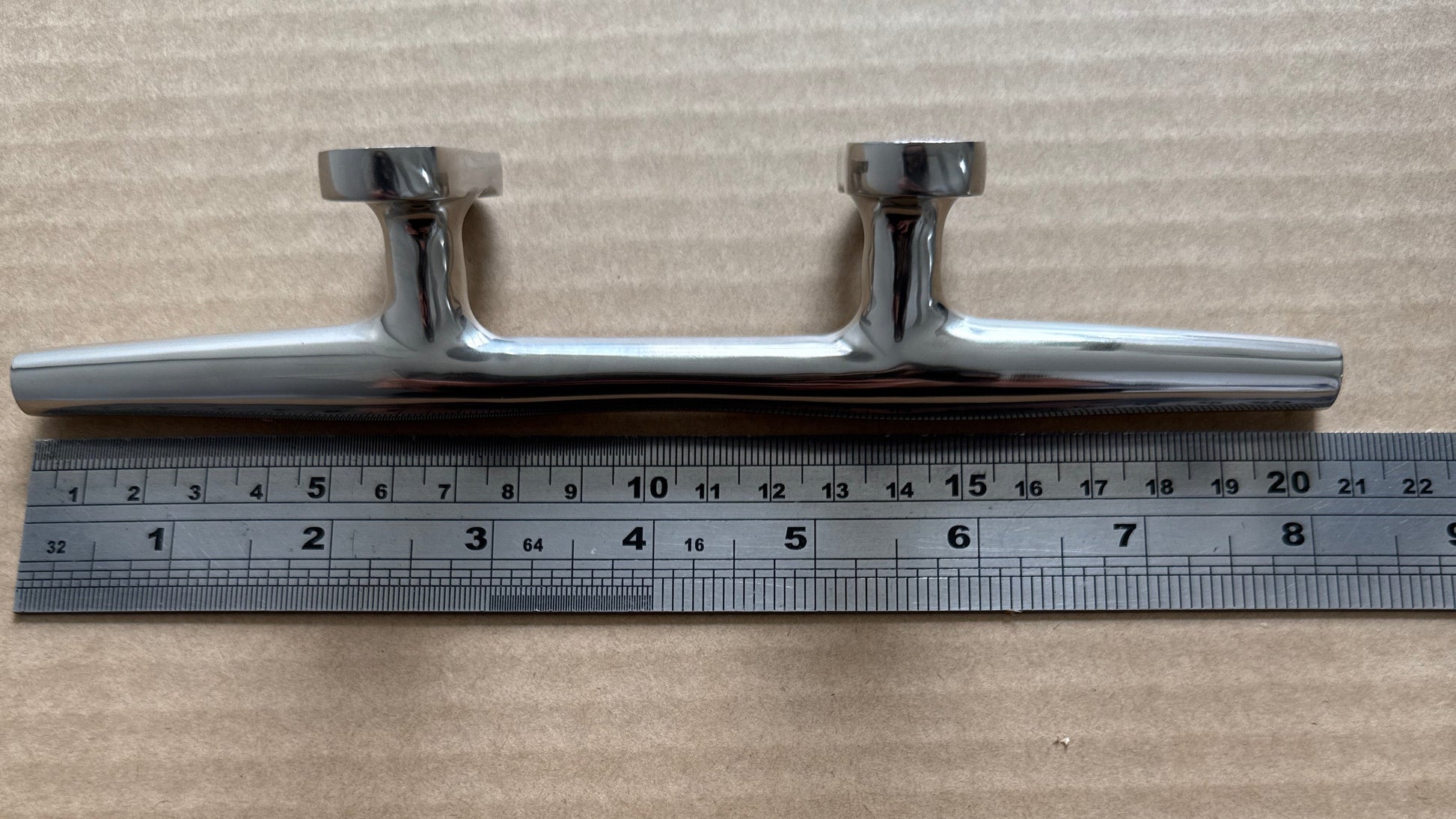 Highly polished 316 stainless steel. Low profile four hole fixing mooring cleat. Not to be confused with similar cleats with only two hole fixings. The four holes give the cleat much greater strength when under sideways tension. This is a decent sized cleat being 205mm, 8inches long. Depth under cleat horn to the deck is 26mm.