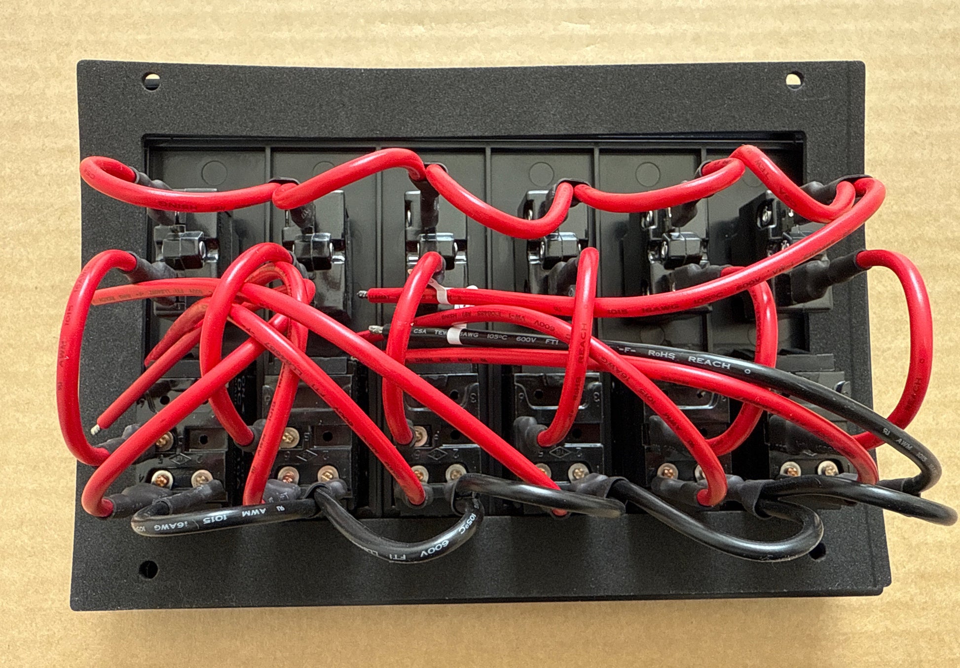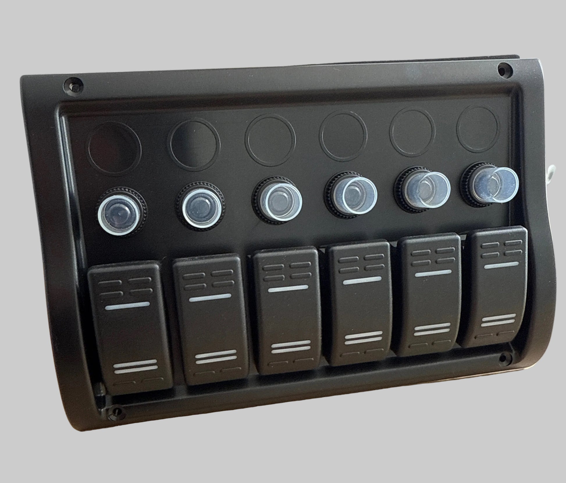 Weatherproof six illuminated rocker switches with six individual circuit breakers.