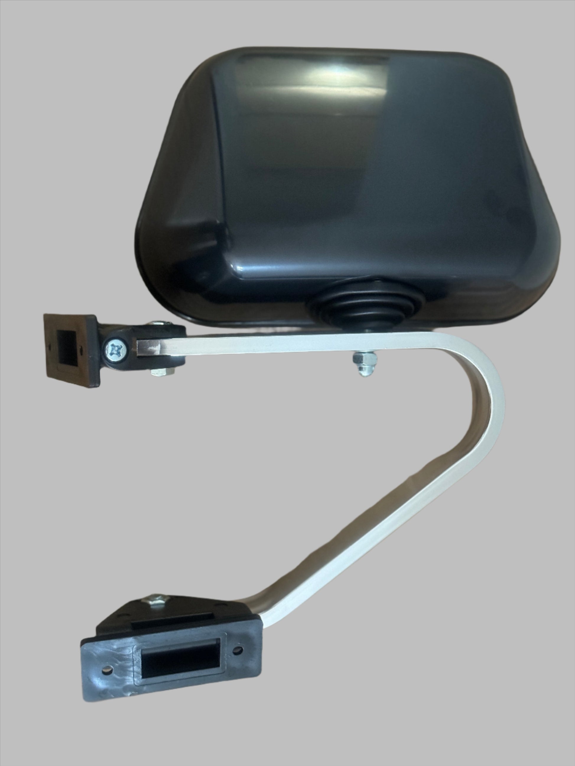 Black ABS mirror head with flat lens and metal mounting arm with black plastic attachment bases